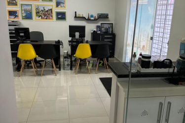 Parte comercial do imóvel conta com sala grande e uma sala pequena, lavabo, copa, e área de serviço separada.